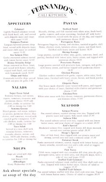 Fernando's Cali Kitchen serves a wide variety of dishes for those in the mode for something new and different—whether dining in or ordering takeout. Now open with good food offering lots of excellent choices, this establishment can't wait to meet new faces discovering Yuba City's best food before closing at 8pm (closed Sundays). This little hidden gem delivers delicious creations—everything made from scratch, nothing heated up from a can like some chain places. Chef on site ensures quality pervading every plate. City vibe meets culinary excellence through quick service and DELICIOUS FOOD earning consistent A+ ratings. The best "Chicken Lemonace" draws repeat visits—it is amazing!!! Portuguese pasta receives A+ acclaim. Salmon piccata garners A+ praise. Salads earn A+ recognition with dressings made from scratch proving delicious. Sonoma greens are the bomb! Sanoma salad stands as favorite alongside seafood pasta requested spicy. Traditional salsa tastes exactly how it should alongside chips. Nachos impress thoroughly. Fish tacos inspire love. Best carnitas ever had. Calamari steak arrives tender and delicious. Fettuccine with prawns—again, delicious! Grilled chicken salads—also delicious. Pasta dishes prove fantastic with interesting appetizers being both Mexican and Italian. Chicken tacos generate unstoppable raving. Carnita tacos pair perfectly with sautéed veggies and fries sides. Nacho fries satisfy alongside all creamy pasta options.
